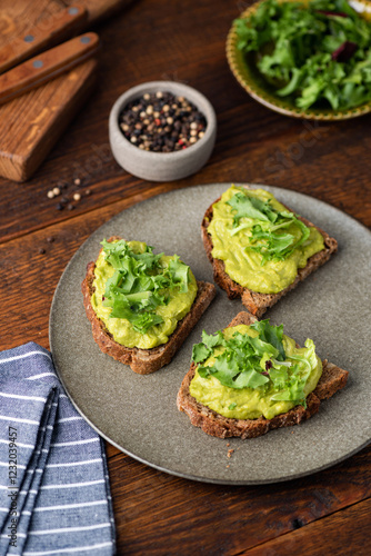 Healthy vegan avocado toast with micro greens on a plate, wooden table background