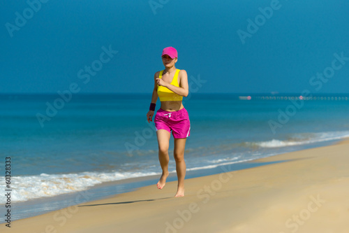 Healthy Woman running on beach. Beautiful fitness adult girl