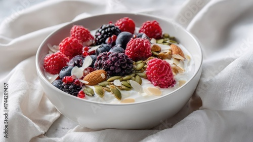 yogurt, berry, breakfast, healthy, food, fruit, bowl, fresh, nourishment, delicious, health food, snack, dairy, raspberry, blueberry, blackberry, almond, seed, nut, wellness, diet, natural, organic, vegetarian, protein, fiber, antioxidant, dessert, white, linen, closeup, vibrant, colourful, epicure, morning, lifestyle, sweet, summer, ingredient, raw, wholesome, healthy lifestyle, healthy breakfast