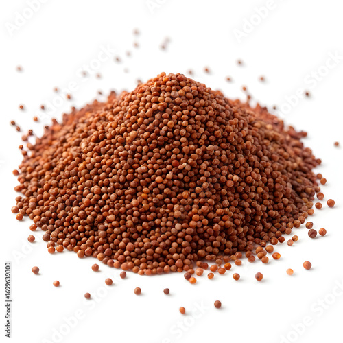 Heap of finger millet (ragi) grains isolated on white background, showcasing their tiny, round texture and nutritious,