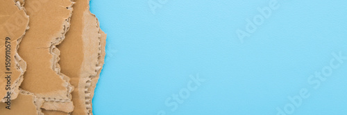 Heap of torn brown carton on light blue table background. Pastel color. Closeup. Wide banner. Empty place for text. Top down view.