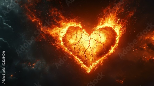 Heart Afire with Cracks Spreading Across a Dark Backdrop