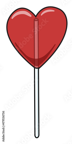 Heart shaped red sweet lollipop hard candy on a stick. Cute romantic Valentines day doodle cartoon hipster style vector illustration isolated on white. For greeting cards, poster or invitation