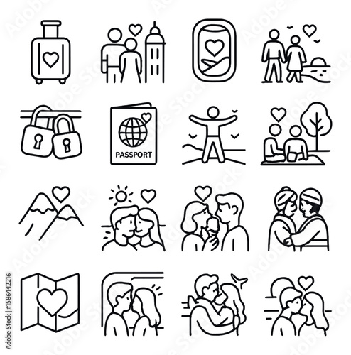 Heartful travel icon collection. love, romance, adventure, passport, vacation, sunset, map, couple, linear
