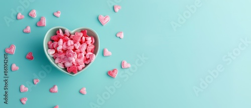 Heart-shaped bowl filled with pink and red candy hearts on a light teal background. Perfect for Valentine's Day or love-themed concepts.