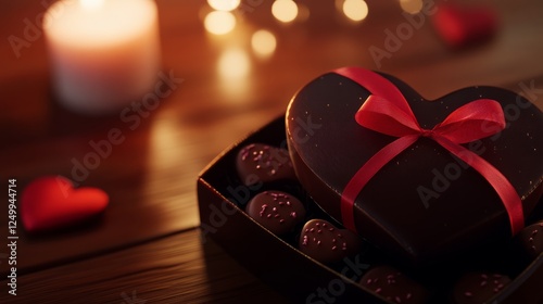 heart-shaped chocolate box, glossy red ribbon, Valentine's Day, romantic dinner, candlelight, warm tones, chocolate gift, love, celebration, gift box, luxury, indulgence, dessert, sweets, couple, affe