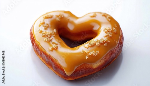 Heart-shaped doughnut with glossy caramel glaze and sprinkled sugar on a white background