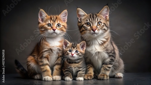 Heartwarming, adorable portrait of three fluffy tabby kittens, sitting side by side with bright, expressive eyes and beautifully striped fur