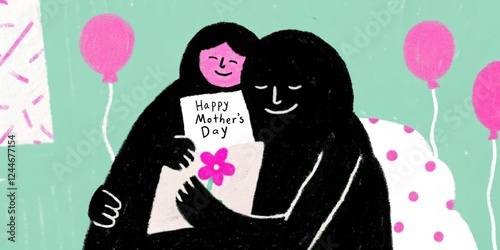 day, hugs, hand-made, card, heartwarming, celebration, love, family, balloon, pink, art, illustration, greeting, holiday, parenthood, mother, children, affection, warmth, happiness, joy, sentiment, decorative, festive, bond, connection, care, tenderness, intimacy, togetherness, cosy, simple, sweet, human relationships, appreciation, joyful, delight, cherish, vignetting, cute, friendly, vibrant, smiling, pastel, nurture