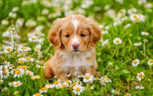 Heartwarming Photo of an Adorable Floppy-Eared Puppy Sitting in a Field of Daisies, Staring Sweetly at the Camera, Creating the Perfect Cute and Playful Scene.
