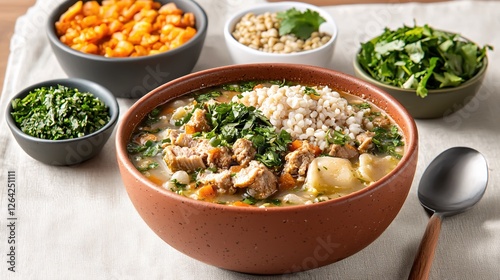 Hearty and Delicious Soup with Meat Barley and Fresh Herbs in Rustic Bowl on Tablecloth