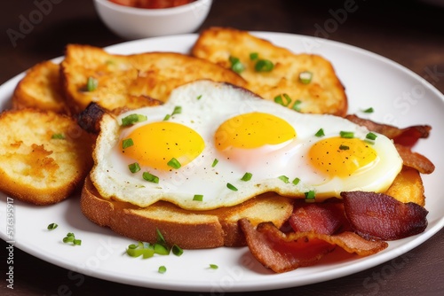 Hearty Breakfast Platter with Fried Eggs, Bacon, Hash Browns, Pudding, Mushrooms, and Toast - Delicious Comfort Food