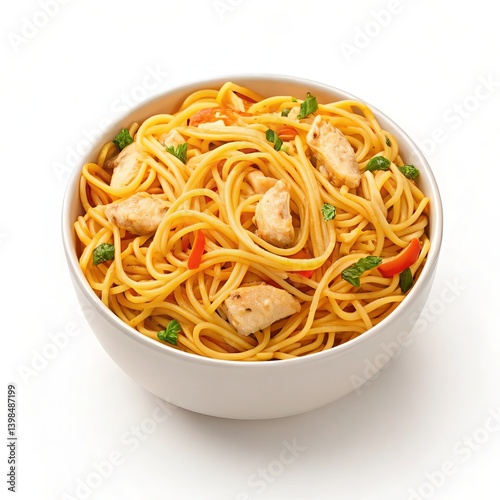 chicken, noodle, meal, food, bowl, pasta, meat, savoury, delicious, dinner, lunch, comfort food, dish, hearty, protein, carbohydrate, parsley, cooked, roasted, baked, white background, studio shot, closeup, appetising, tasty, filling, traditional, homemade, healthy, image, picture, photo, photo