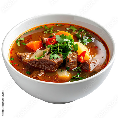 Hearty kansi soup with tender beef chunks and sour broth, expertly captured and isolated on white background