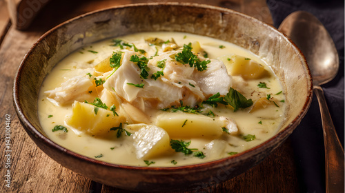 soup, skink, hearty, mouth-watering, fish, potato, creamy, parsley, rustic, bowl, wooden, table, food, meal, culinary, ingredient, cooking, fresh, comfort, dish, traditional, epicure, presentation, serving, broth, warmth, appetising, cosy, delicious, receipe, nourishment, flavorful, savoury, homemade, artisan, healthy, dining, seasonal, style, evening, lunch, dinner, texture, richness, natural