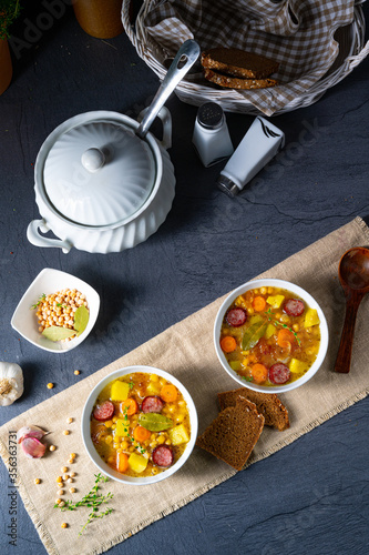 soup, pea soup, meal, polen, german, dish, food, pea, dinner, sausage, winter, table, healthy, meat, bread, speck, spoon, rural, traditional, wooden, epicure, paint, holland, part, forest, ingredient, pork, dining table, delicious, warm, cooking, clothes, polish, german