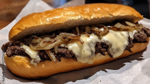 Hearty Philly cheesesteak thinly sliced beef melted cheese and sauted onions in a toasted roll