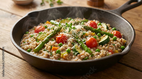 food, cooking, pan, frying pan, cast iron, risotto, barley, grain, rice, brown rice, vegetarian, healthy, vegetable, asparagus, tomatoes, cherry tomato, courgette, pea, green peas, corn, cheese, parmesan, herb, thyme, garnish, rustic, wooden, table, meal, dinner, lunch, cookery, delicious, tasty, savoury, steaming, hot, fresh, organic, colourful, mediterranean, italian, comfort food, homemade, epicure, nourishment, diet, culinary