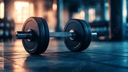 Heavy dumbbell on the gym floor in a modern fitness center.