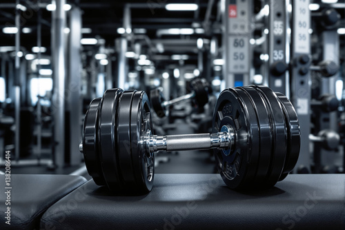 Heavy dumbbell placed on workout bench in modern gym interior with blurred fitness equipment in background. Concept of strength and sport. Ai generative