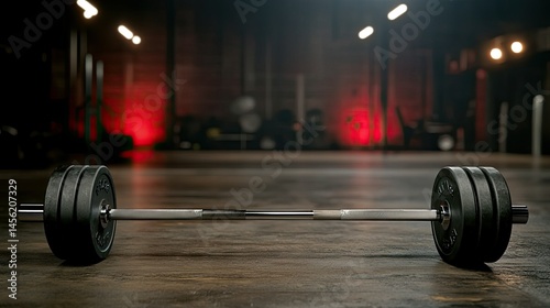 Heavy dumbbell rest on polished gym floor with dramatic lighting set in a modern fitness studio during evening hours