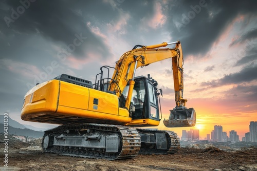 Heavy excavator working on road construction at sunset in an urban area with buildings and dramatic clouds in the background