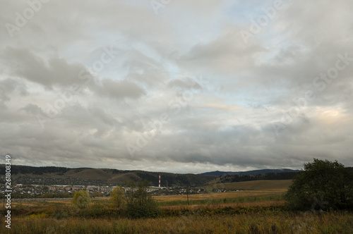 Heavy grey clouds in the cold autumn sky over village with small houses far away in the mountains and fields. Travelling. People living