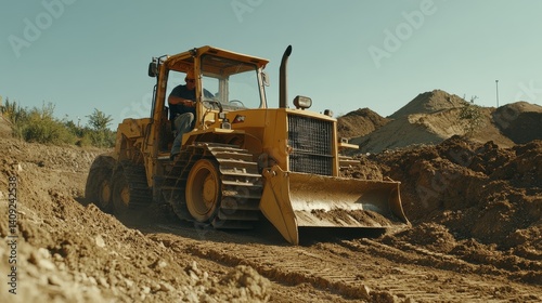 Heavy machinery operator using a bulldozer to clear land. Featuring coordination and precision