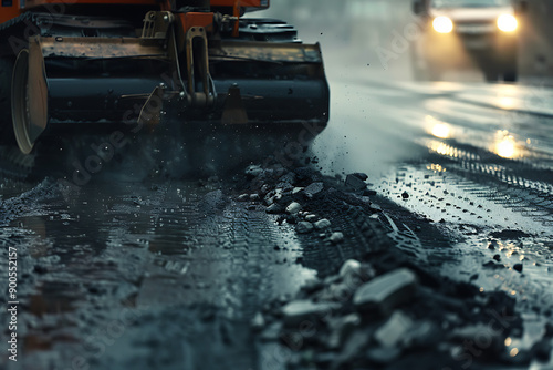 Heavy road equipment repairing the road and laying fresh asphalt, showcasing modern construction and infrastructure maintenance. The scene highlights the machinery, workers, and process involved in ro