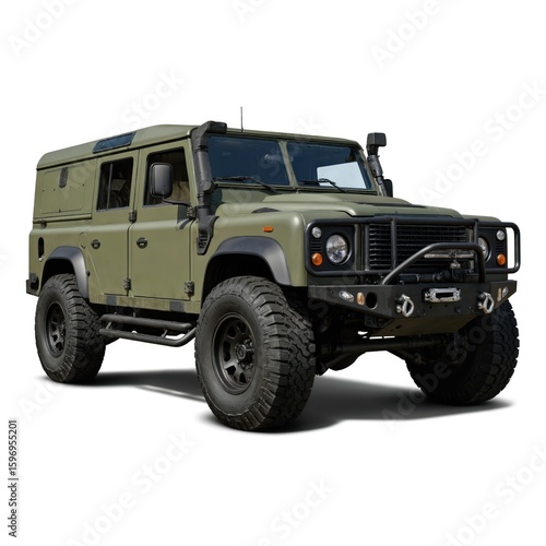 Heavy-duty green off-road vehicle with reinforced bumpers, snorkel. Rugged SUV boasts powerful off-road capabilities for extreme terrain adventures. Built for durability, automotive icon offers