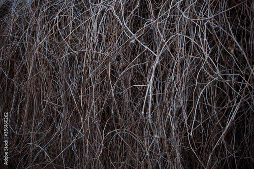 Hedge of dry vine branches, nature background. Abstract of dry toned twigs on the fence.