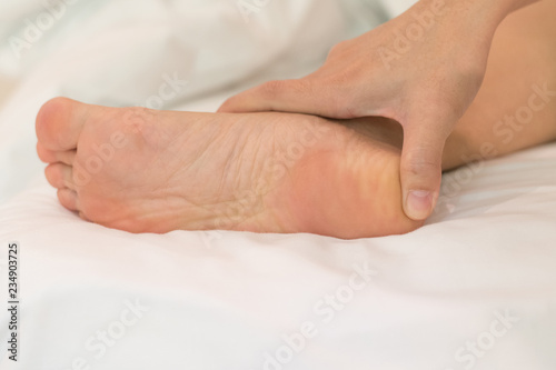 Heel Pain or plantar fasciitis concept. Hand on foot as suffer from inflammation feet problem of Sever's Disease or calcaneal apophysitis.