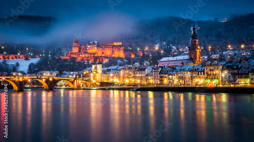 winter, travel, town, tour tourism, snow, scenic, river, panorama, night, neckar, mist, mediaeval, light, landscape, hill, german, fog, evening, german, cold, city, church, castle, bridge, heidelberg, tourist destination, old bridge, schloss, long exposure, travel destination, street light