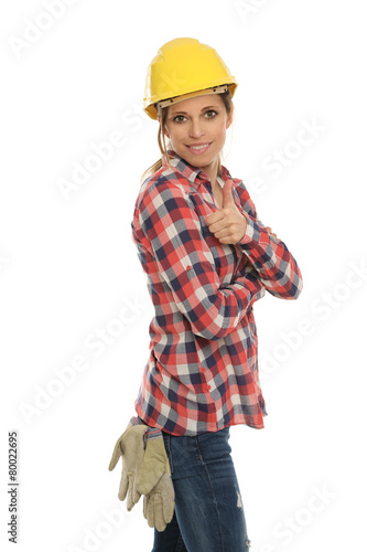 construction, blond, thumb up, woman, glove, craft, craftsmanship, helmet, shirt, young, slim, athletic, strong, security, conversion