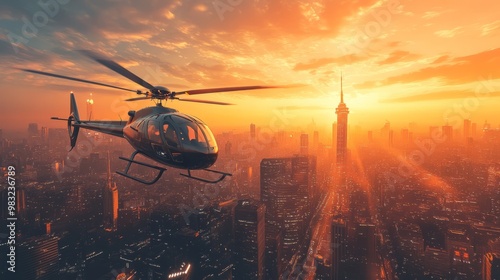 helicopter, city, sunset, aerial, skyline, urban, travel, adventure, modern, scenic, evening, landscape, sunlight, building
