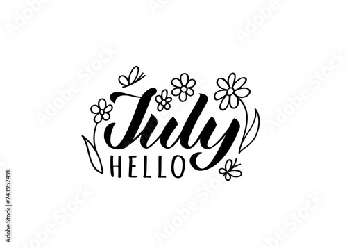 Hello July hand drawn lettering card with doodle flowers and butterflies. Inspirational summer quote. Motivational print for invitation or greeting cards, brochures, poster, t-shirts, mugs.