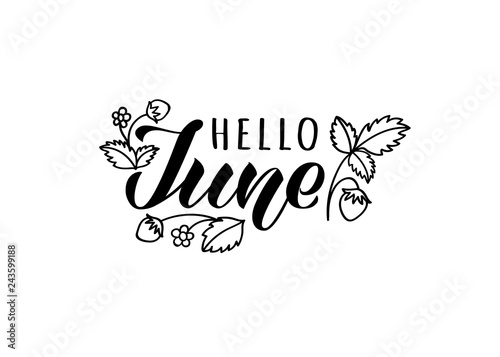 Hello june hand drawn lettering card with doodle leaves and strawberries. Inspirational summer quote. Motivational print for invitation or greeting cards, brochures, poster, t-shirts, mugs.