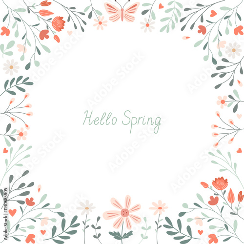 Hello Spring greetings on square frame with beautiful leaves and flowers. Vector flat style illustration in pastel colors. Perfect for greeting cards, invitations, seasonal banners, holiday designs.