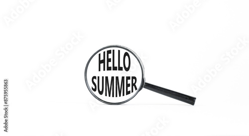 Hello summer symbol. Concept words Hello summer in beautiful magnifying glass. Beautiful white paper background. Business lifestyle Hello summer concept. Copy space.