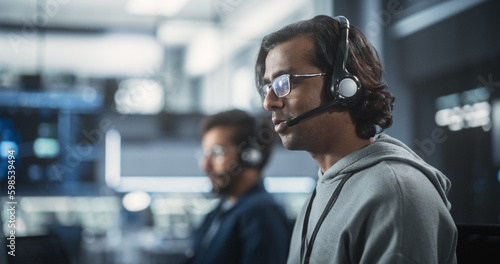 Help Desk Specialist Answering a Call, Providing Technical Support to Client Experiencing Computer Hardware and Software Issues. Indian Male Using a Headset to Have a Conversation with a Tech Team