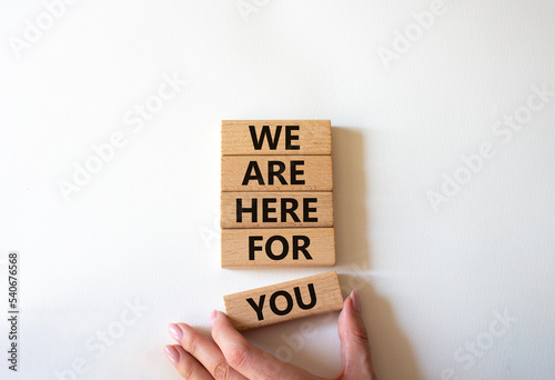 Help symbol. Wooden blocks with words We are here for you. Beautiful white background. Businessman hand. Business and We are here for you concept. Copy space.