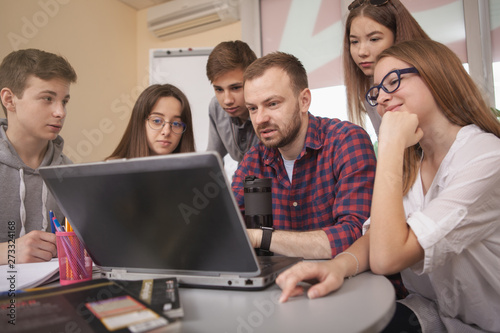 Helpful male teacher using laptop at class, working on a project with his teenage students. Experienced mature mentor working with teenagers at school
