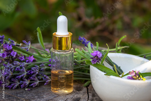 Herbal oil and lavender flowers on a wooden background. Nature.