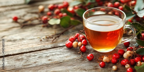 Herbal tea infused with fresh hawthorn berries rests on a wooden table, showcasing the vibrant colors and natural elements of the herbal tea and hawthorn berries in a cozy setting.