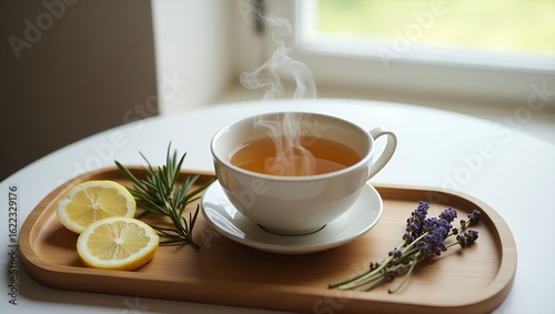 tea, herbal, steam, wellness, lifestyle, lavandula, lemon, rosemary, healing, drink, organic, calm, relaxation, warm, minimalist, sharpened, clean, natural, healthy, routine, ritual, balance, aesthetic, neutral, wooden, tray, aroma, brewed, teacup, herb, well-being, mindful, health, still life, cosy, zen, beverage, hydratation, simplicity, peaceful, nature, infusion, simple, clear, calming
