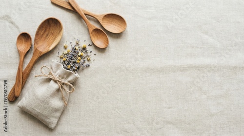 Herbs Dried Lavender and Chamomile with Wooden Spoons on Linen Fabric
