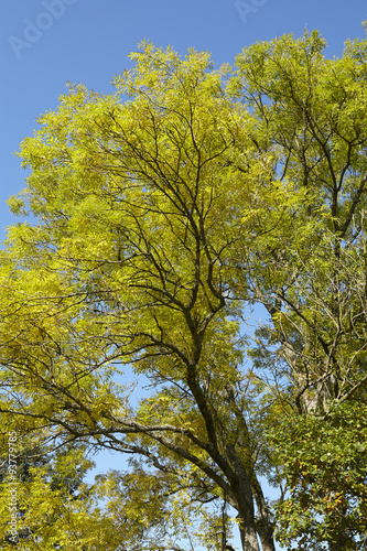 tree, autumn, autumn, leaf, yellow, green, yellow, green, blue skies, heaven, beaming, broadleaf tree, treetop, sunny, daylight, fall foliage, indian summer, luminescent, colourful