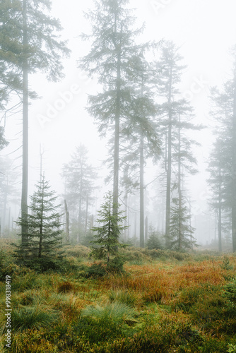 pine forest, forest, tree, fog, wet, rain, autumn, green, damp, german, nature, tree