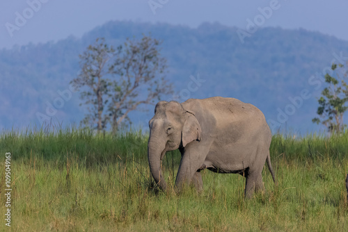 Herd of Asiatic elephant (Elephas maximus) at the grassland of forest to eat grass and mud bath.