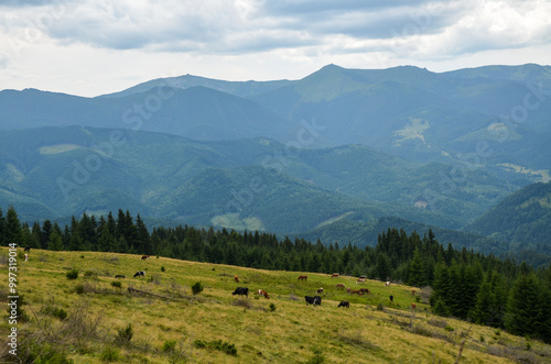 mountain, ukraine, hill, pasture, grazing, grass, cow, outdoors, vale, green, forest, cattle, sky, animal, nature, meadow, farm, herd, brown, milk, village, domestic, mountain chain, beautiful, travel, tree, field, land, idylli, day, summer, cloud, mammal, scenery, scenic, carpathians, countryside, farmland, rolling hills